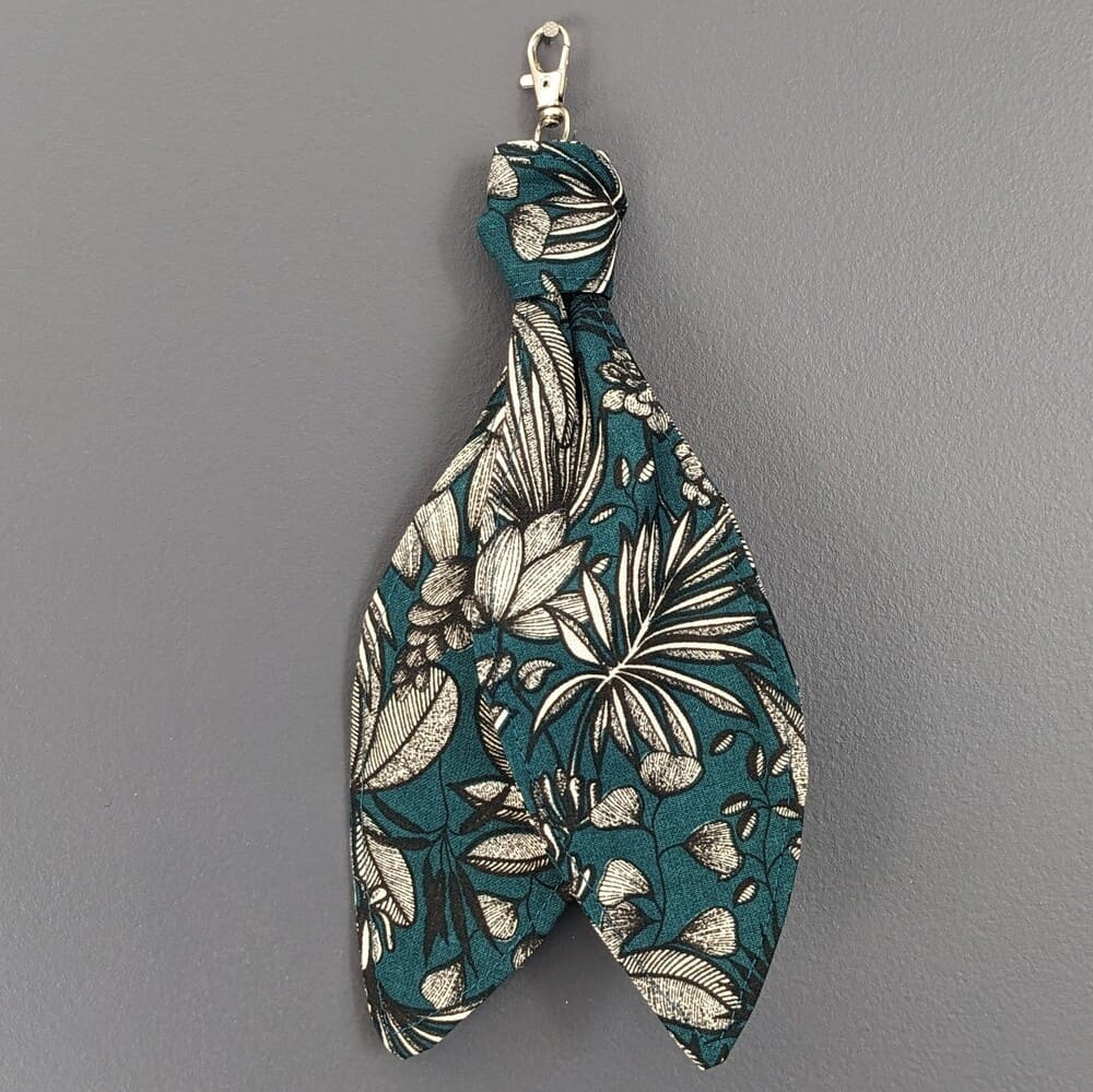 Découvrez l’authenticité et l’artisanat breton avec ce bijou de sac, qui peut faire aussi office de porte-clé en tissu « Feuillage sur fond vert canard ». Il saura habiller délicatement votre sac, accroché à l’une de ses anses.