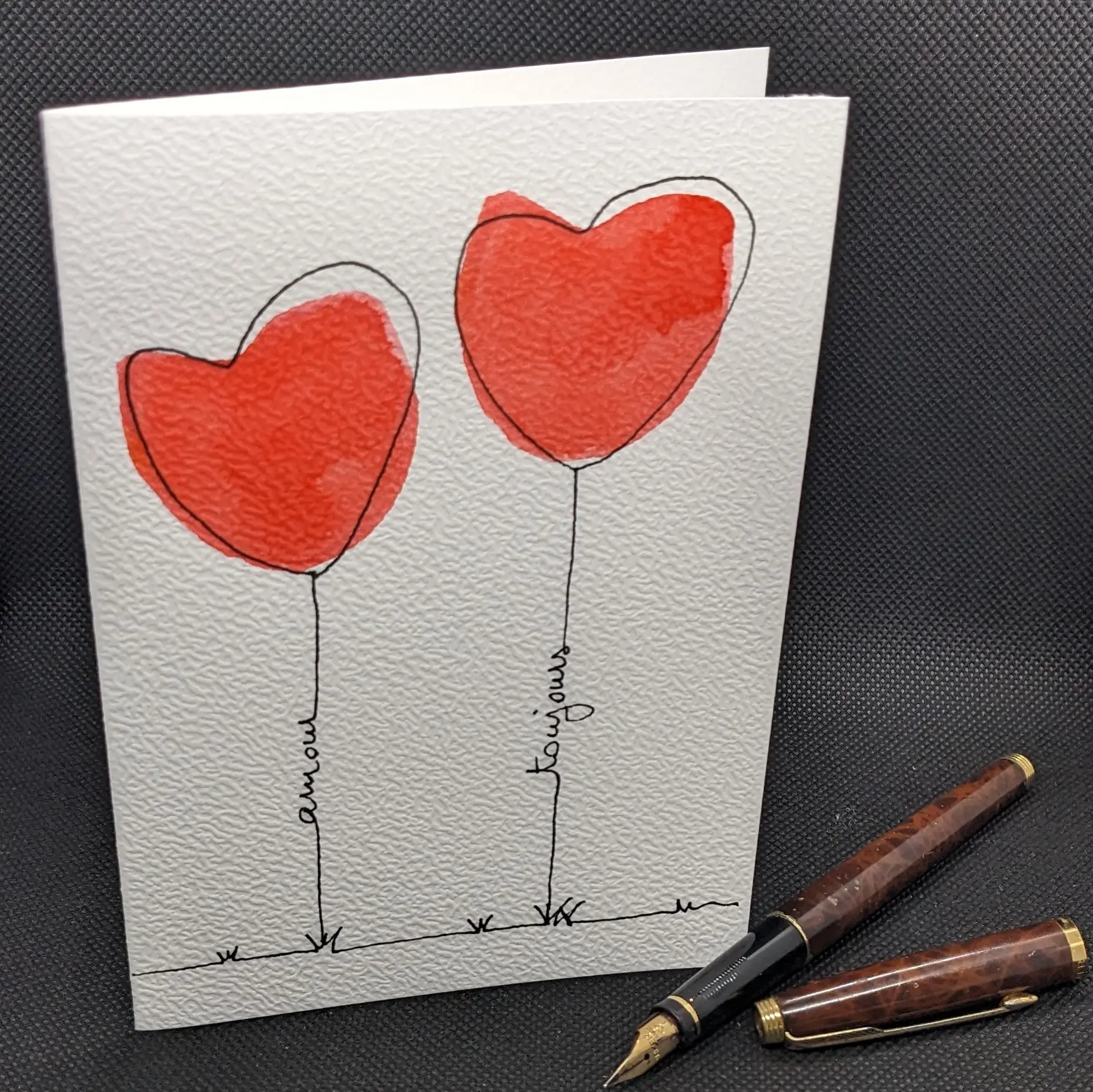 Carte à l’aquarelle et au feutre, nommée « Amour toujours« . Chaque carte est une pièce unique, peinte à la main à l’aquarelle, qui fera plaisir à sa destinataire.