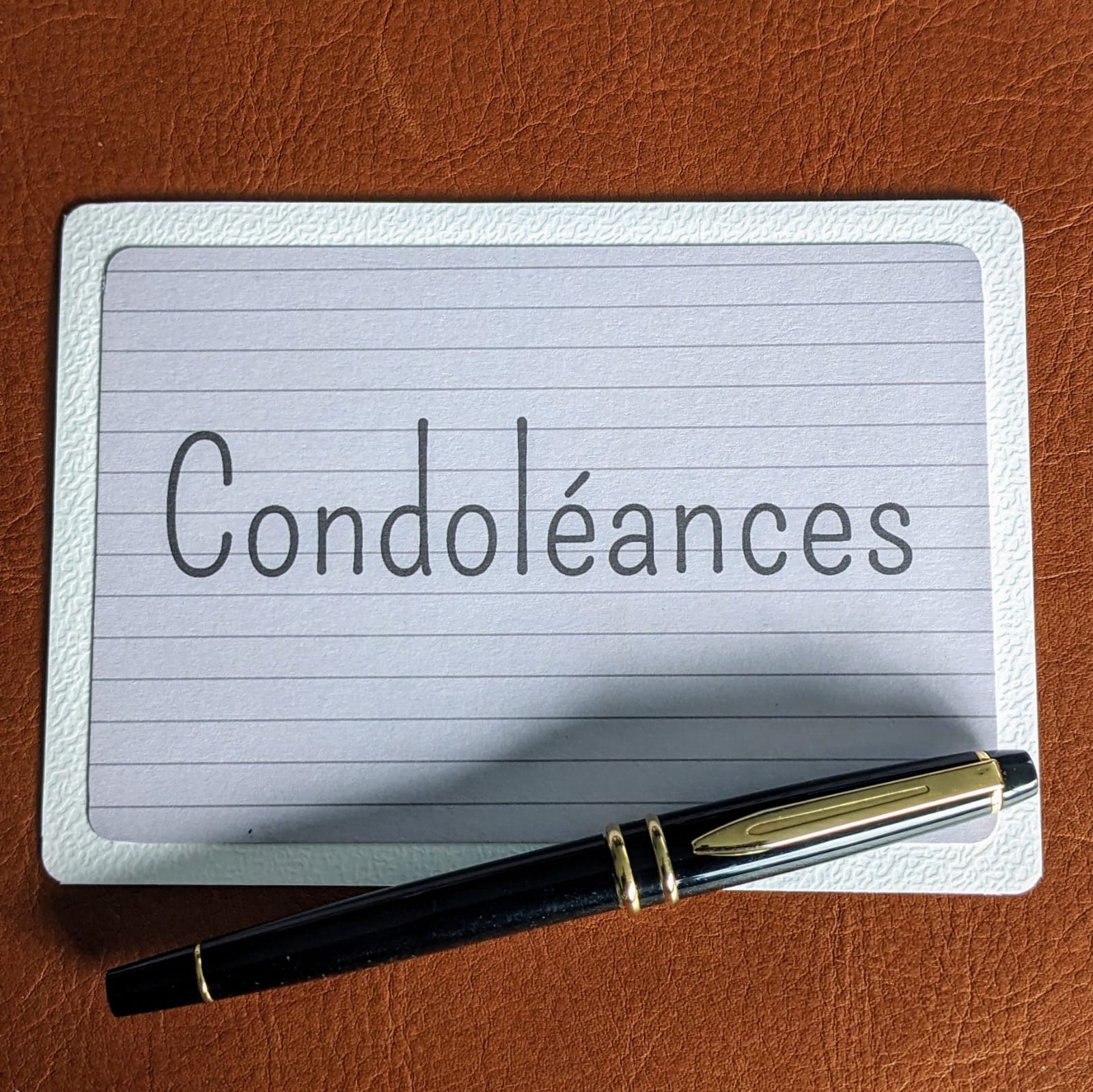 - Design : Condoléances, imprimé sur un motif de fines rayures sur fond gris clair.