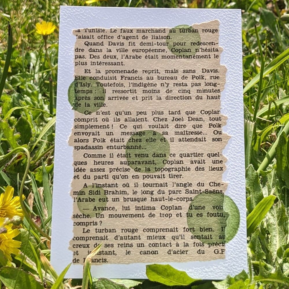 Carte à l’aquarelle, nommée « Bulles kaki échappées d’un livre« . Chaque carte est une pièce unique, peinte à la main avec des aquarelles de qualité, qui fera plaisir à son destinataire.