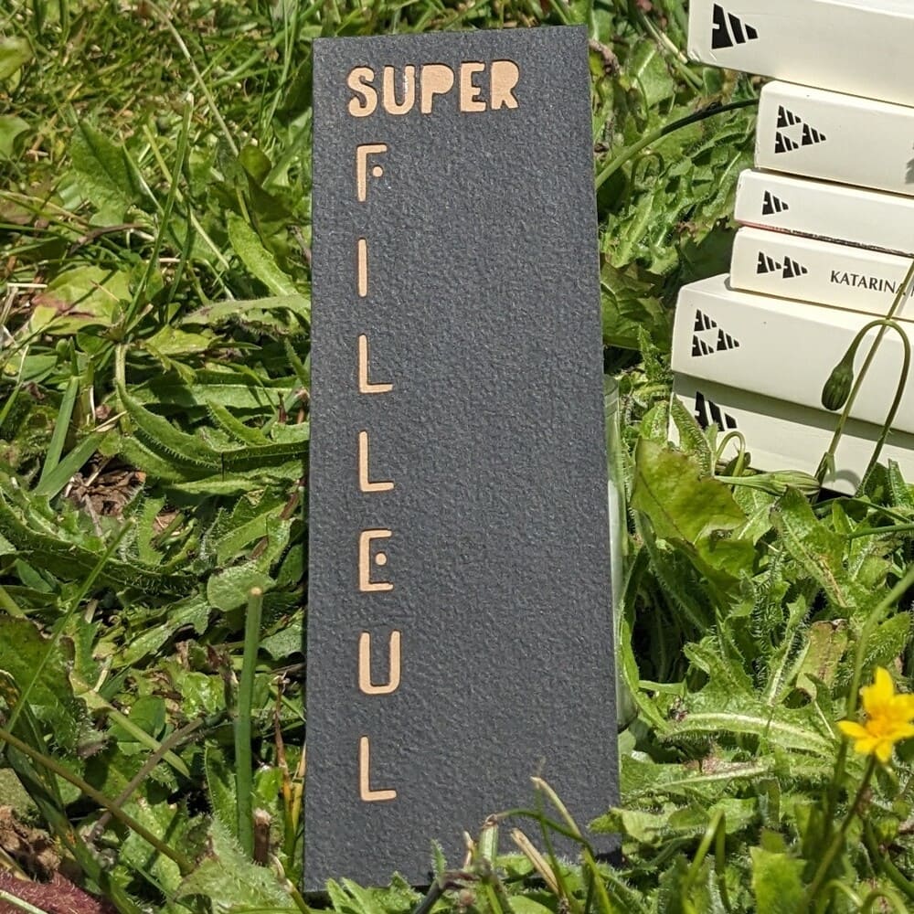Découvrez notre magnifique marque-page, nommé « Super Filleul« . Cadeau idéal à offrir à l’occasion de la communion ou autre occasion religieuse ou laïque. Chaque marque-page est une pièce unique. Les mots sont découpés dans le papier noir, qui est collé sur le papier cartonné beige.