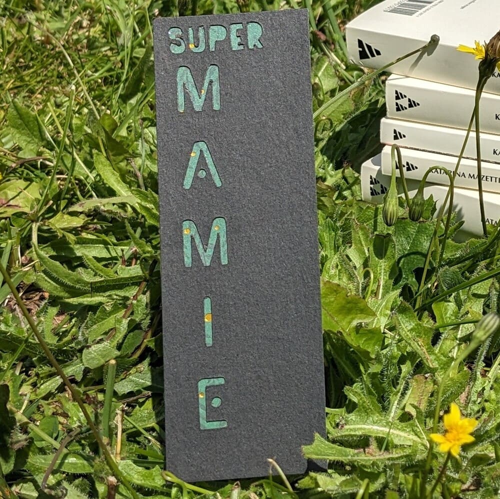 Marque-page, nommé « Super mamie« . Chaque marque-page est une pièce unique. Les mots sont découpés dans le papier noir, qui est collé sur le papier cartonné vert et doré. A offrir à une mamie qui aime lire.