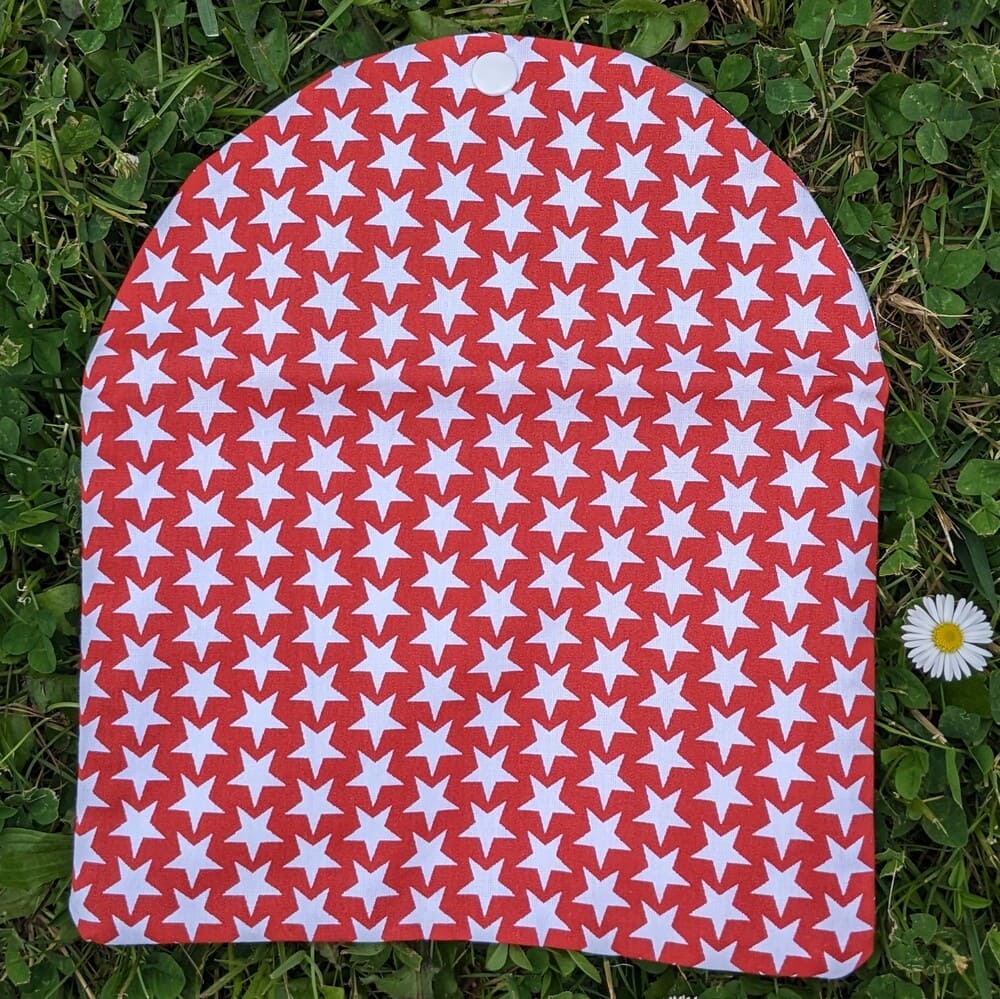 - Matériaux : Extérieur : coton avec des étoiles blanches sur fond orangé. Intérieur : coton blanc. Bouton pression blanc en plastique