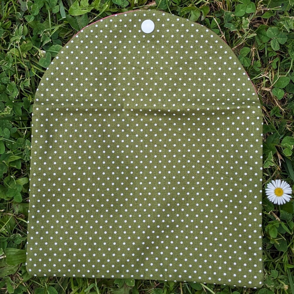 - Matériaux : Extérieur : coton kaki à pois blancs. Intérieur : coton rose fuchsia. Bouton pression blanc en plastique