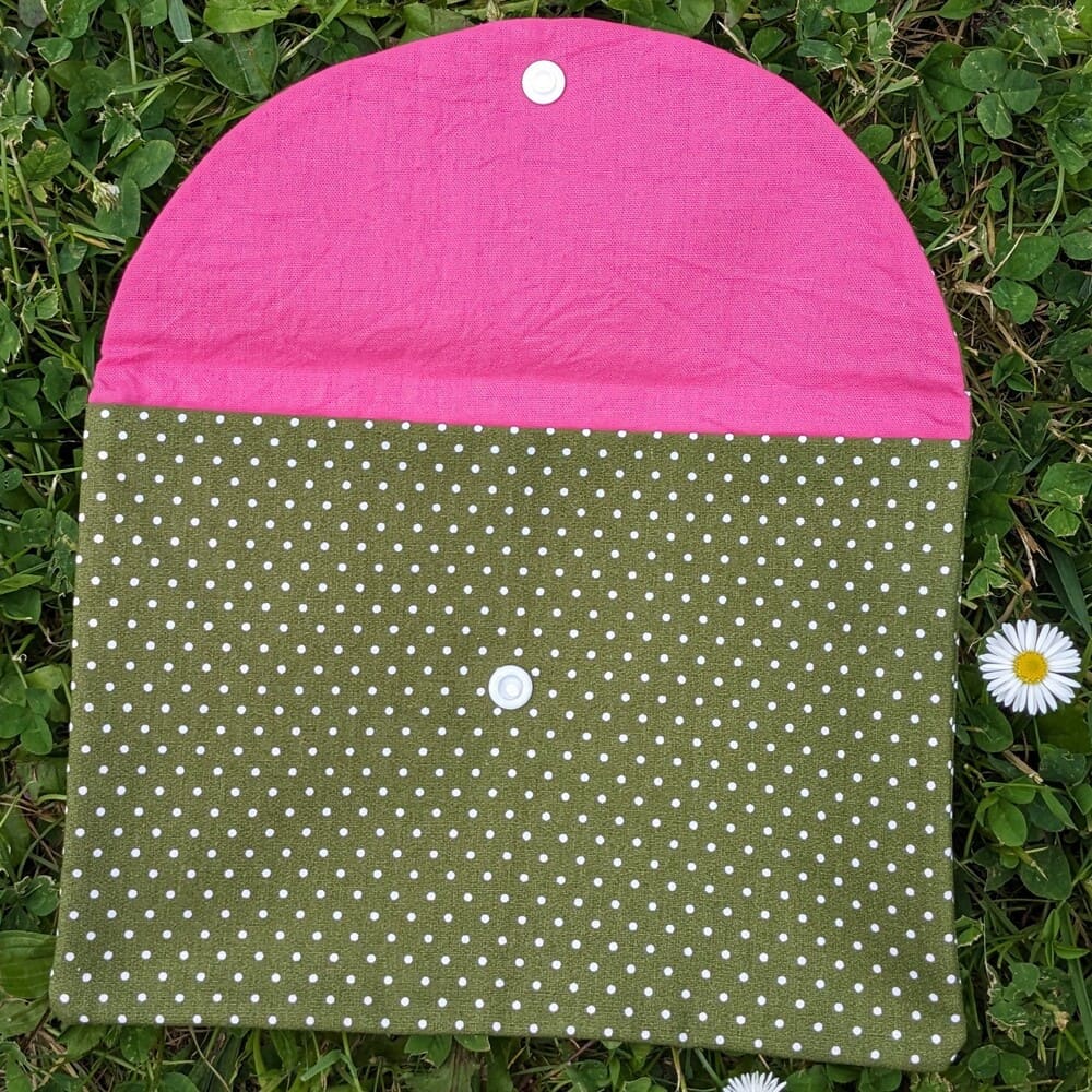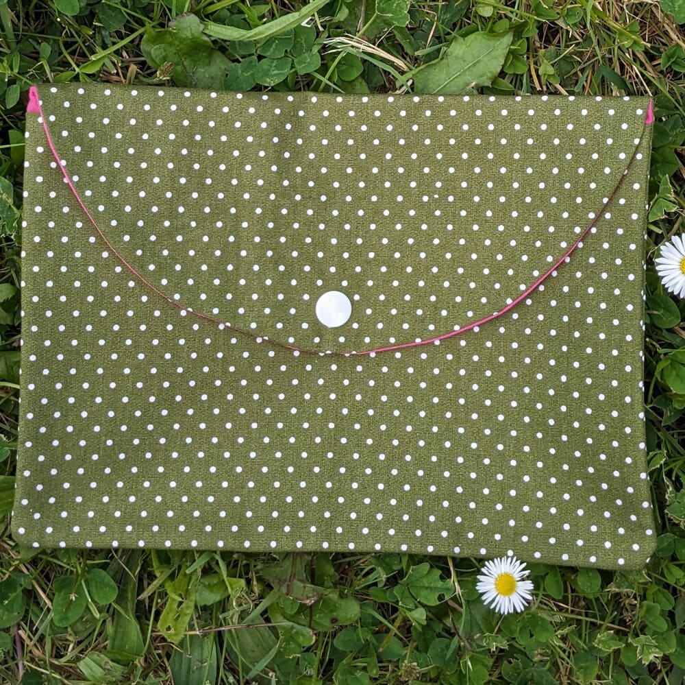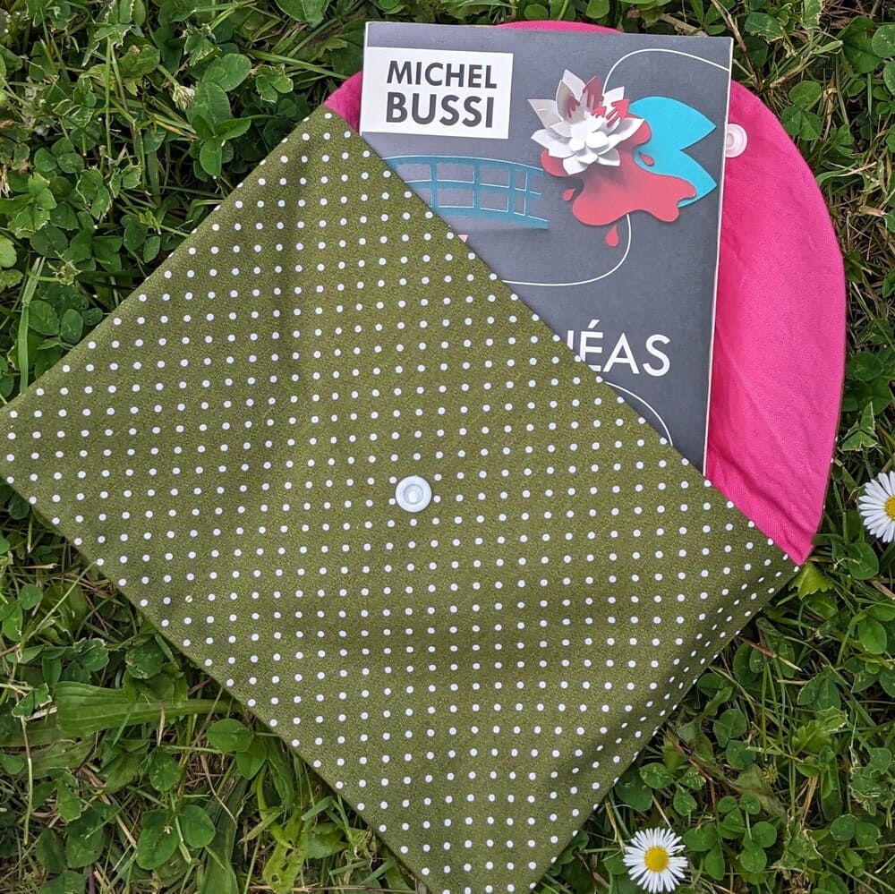 Pochette kaki en tissu, pratique pour ranger les livres de poche. Chaque pochette est réalisée à la main dans mon atelier du Golfe du Morbihan, garantissant une pièce unique et originale qui protégera vos livres avec style.